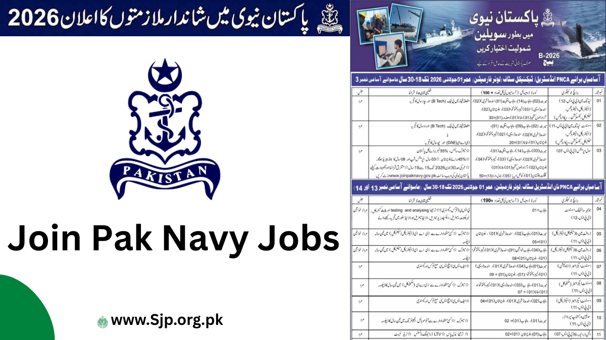 Pakistan Navy Civilian Jobs 2026 (Batch B-2026) have been officially announced. Eligible candidates can now apply online through the official Pakistan Navy website at joinpaknavy.gov.pk. The online registration process for civilian positions is currently active, and applicants are encouraged to submit their forms promptly. The job advertisement was published in newspapers on February 8, 2026, and the registration period will remain open from February 8 to February 22, 2026. Interested individuals can complete their online application via the official portal www.joinpaknavy.gov.pk.